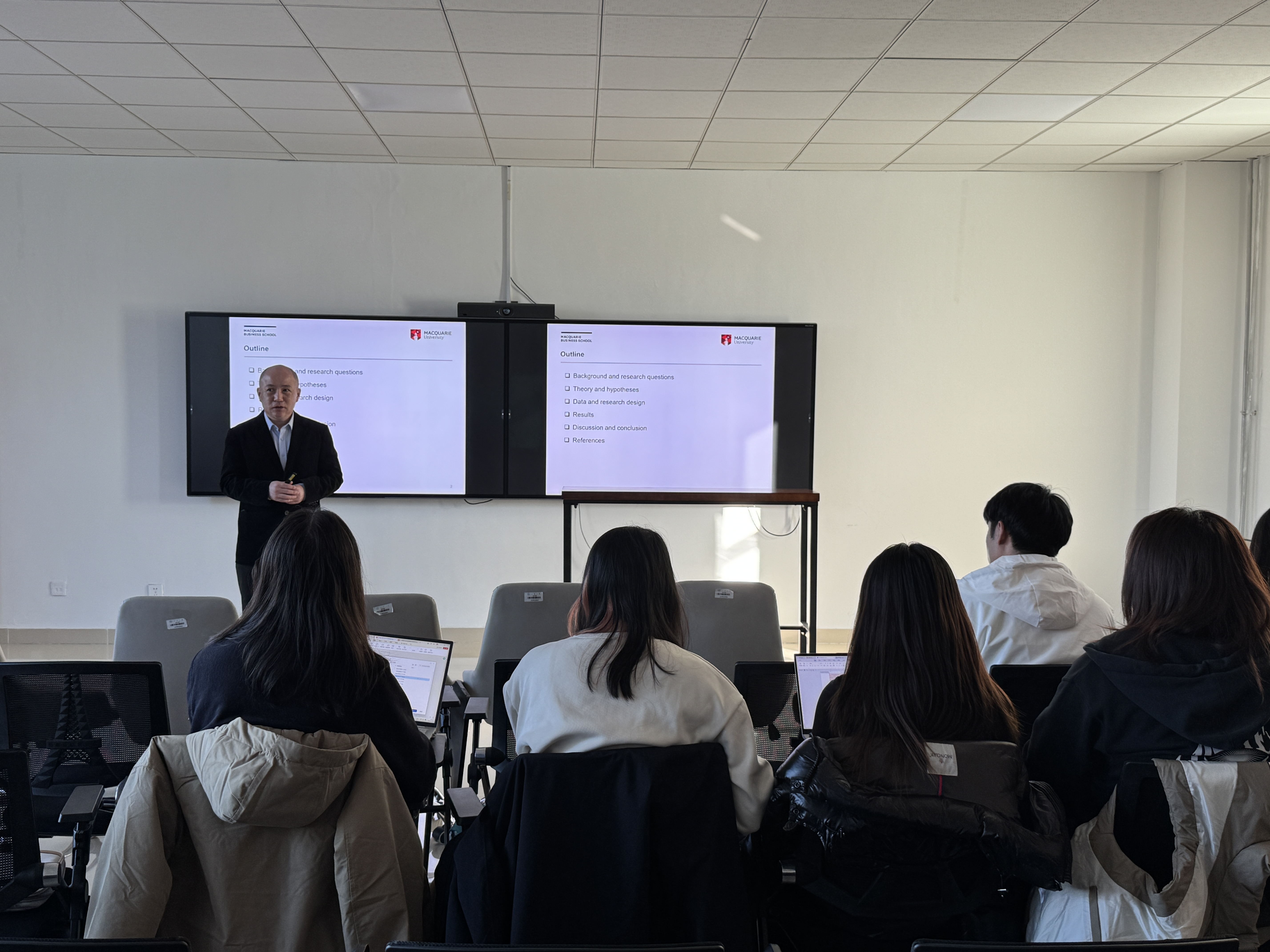 报告结束后,澳大利亚麦考瑞大学路英老师作为学校国际商务硕士学位、商科硕士国际商务专业负责人分享了学生培养的经验与心得,并与国创学院教师赵云、夏宇寰、刘怡、外事助理胡爽老师一起讨论了学生培养国际合作的可行路径与未来计划。