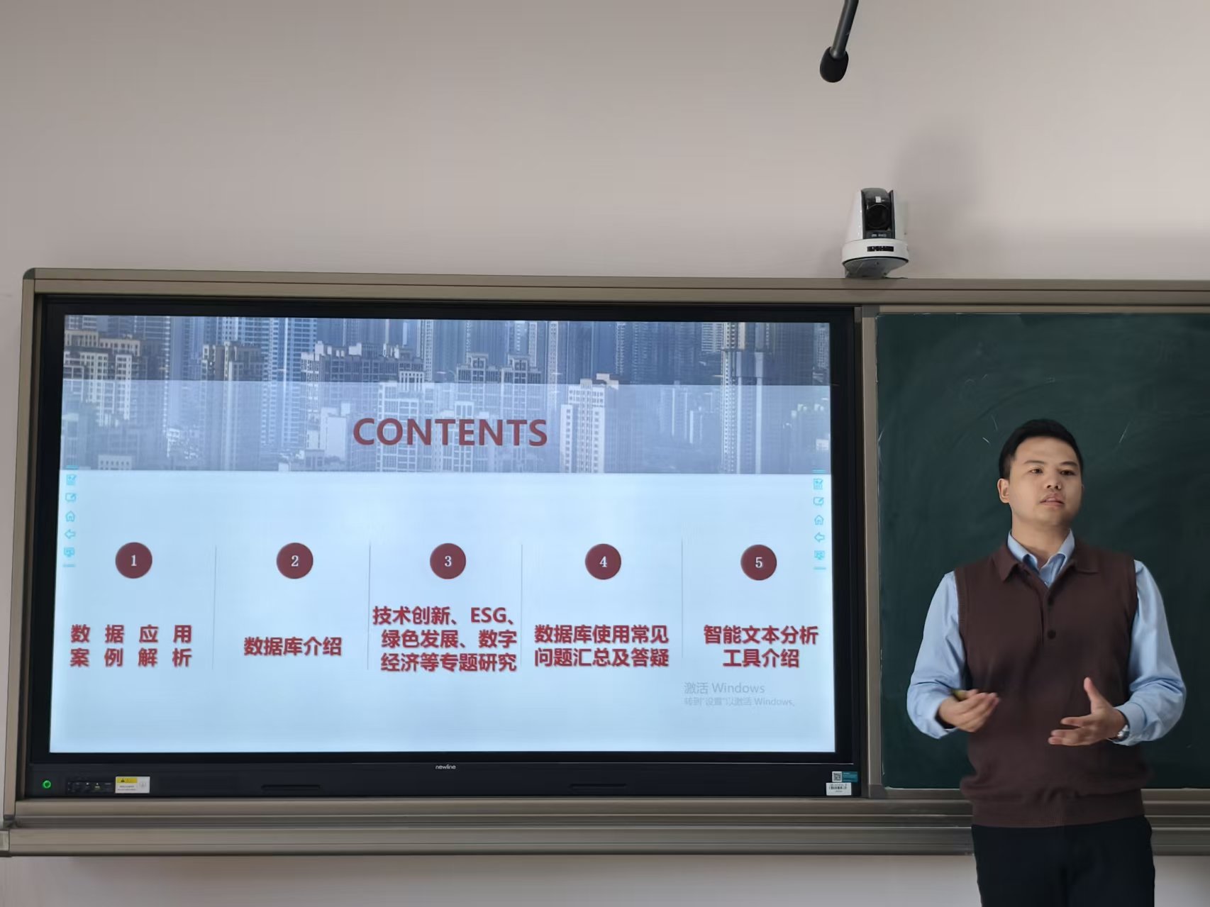 许明臻讲师以一篇发表于《管理世界》的经典文献为例,生动演示了如何利用上市公司供应链数据,构建合作关系网络指标,并实证检验供应链风险对企业合作行为的影响。随后,系统展示了数据平台旗下的多个核心数据库,涵盖公司特征、经济统计与基础数据三大体系。在专题研究部分,他重点分享了平台在技术创新、ESG与绿色发展、数字经济等热点领域的深度数据布局。此外,他演示了智能文本分析工具的强大功能,如何从年报、政府工作报告等非结构化文本中高效提取“绿色治理指数”、“数字化关键词”等研究变量。