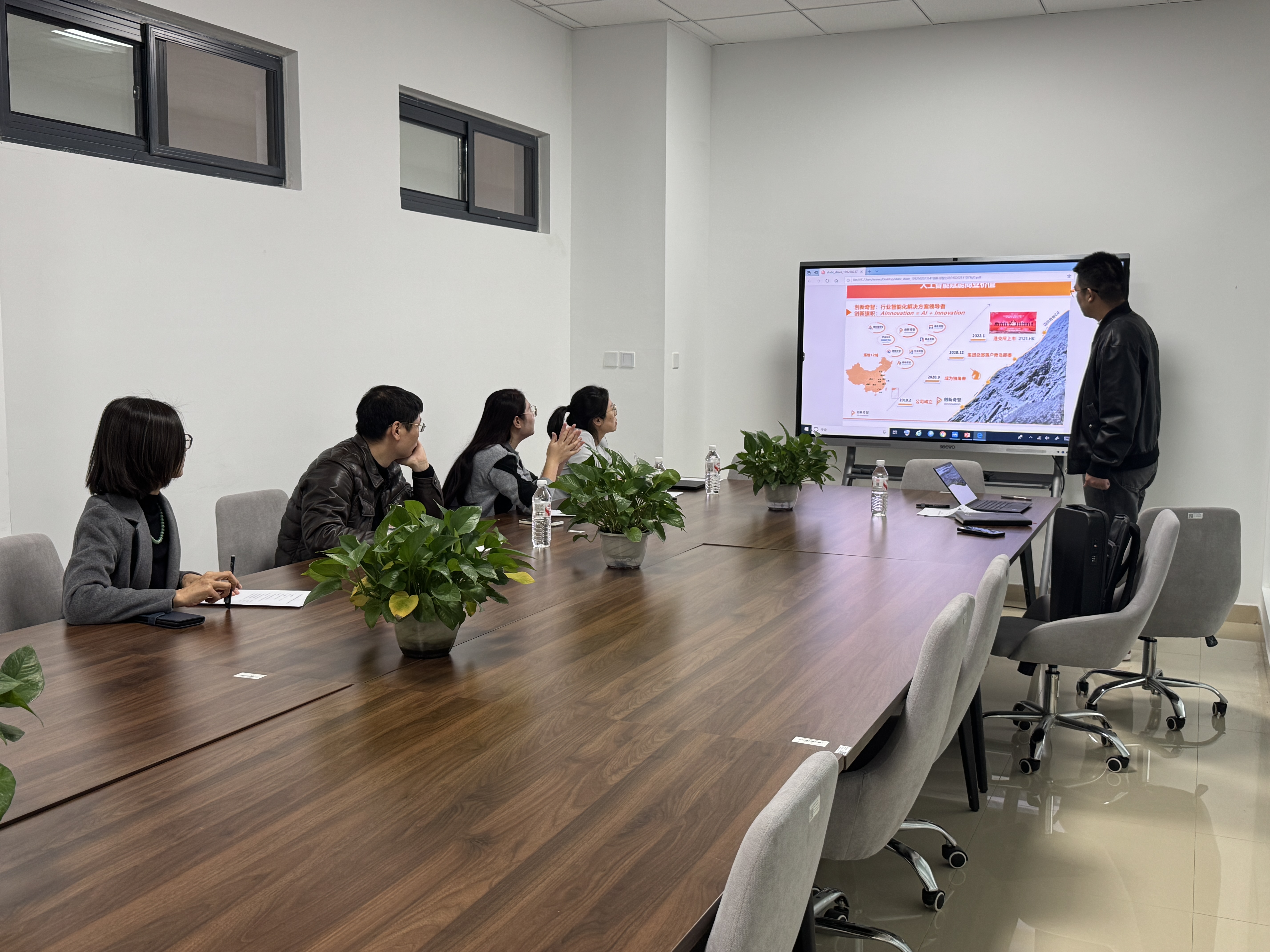 创新奇智科技集团公司市场总监解星汉介绍了公司的基本情况。创新奇智目前致力于用前沿的人工智能技术为企业提供AI产品及解决方案,提高客户运营效率和商业价值。聚焦打造“工业软件、数智软件、工业物流、智能装备、工业可持续”五大业务主题,赋能八大制造业细分市场专精特新。并重点介绍了技术双塔架构、专利布局、学术积累、团队构成以及校企合作成果。他表示,希望通过此次交流,推动山东大学和创新奇智科技集团公司在技术转化、人才培养、项目共建等方面的深度合作。