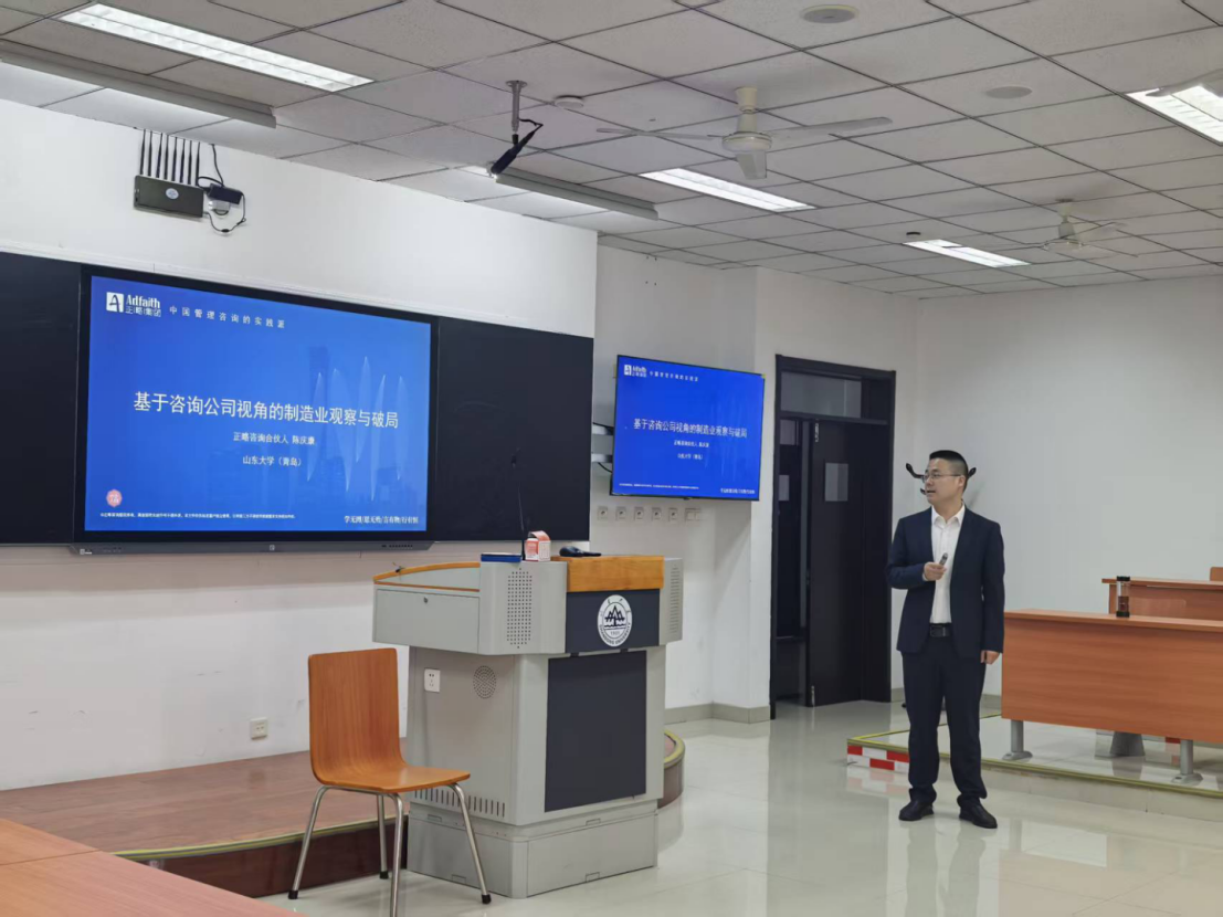 为深入解读制造业转型发展的核心逻辑,助力学生把握产业升级新机遇,拓宽学生职业发展新思路,2026年3月27日,由山东大学国际创新转化学院举办的“制造业破局与转型”专题讲座在山东大学青岛校区振声苑E202教室圆满举办。