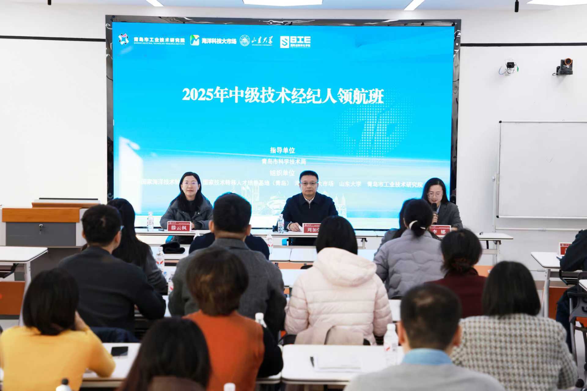 11月25日,在青岛市教育局的大力支持下,2025年中级技术经纪人领航班(山东大学专场)在山东大学青岛校区正式开班。山东大学青岛校区党工委委员、副校长周加强,青岛市工业技术研究院院长、海洋科技大市场负责人滕云枫出席开班仪式并讲话。